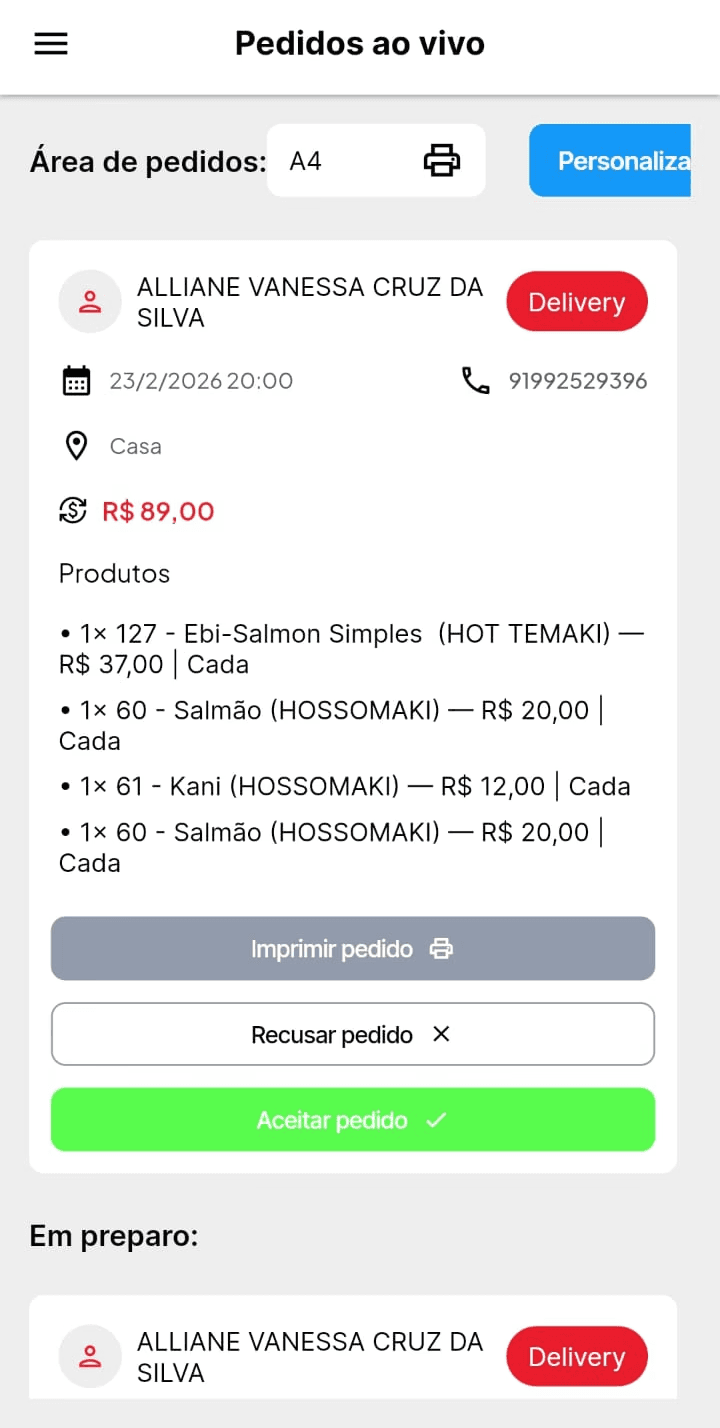 Acompanhe todos os pedidos conforme chegam, com status atualizado e controle total do fluxo.