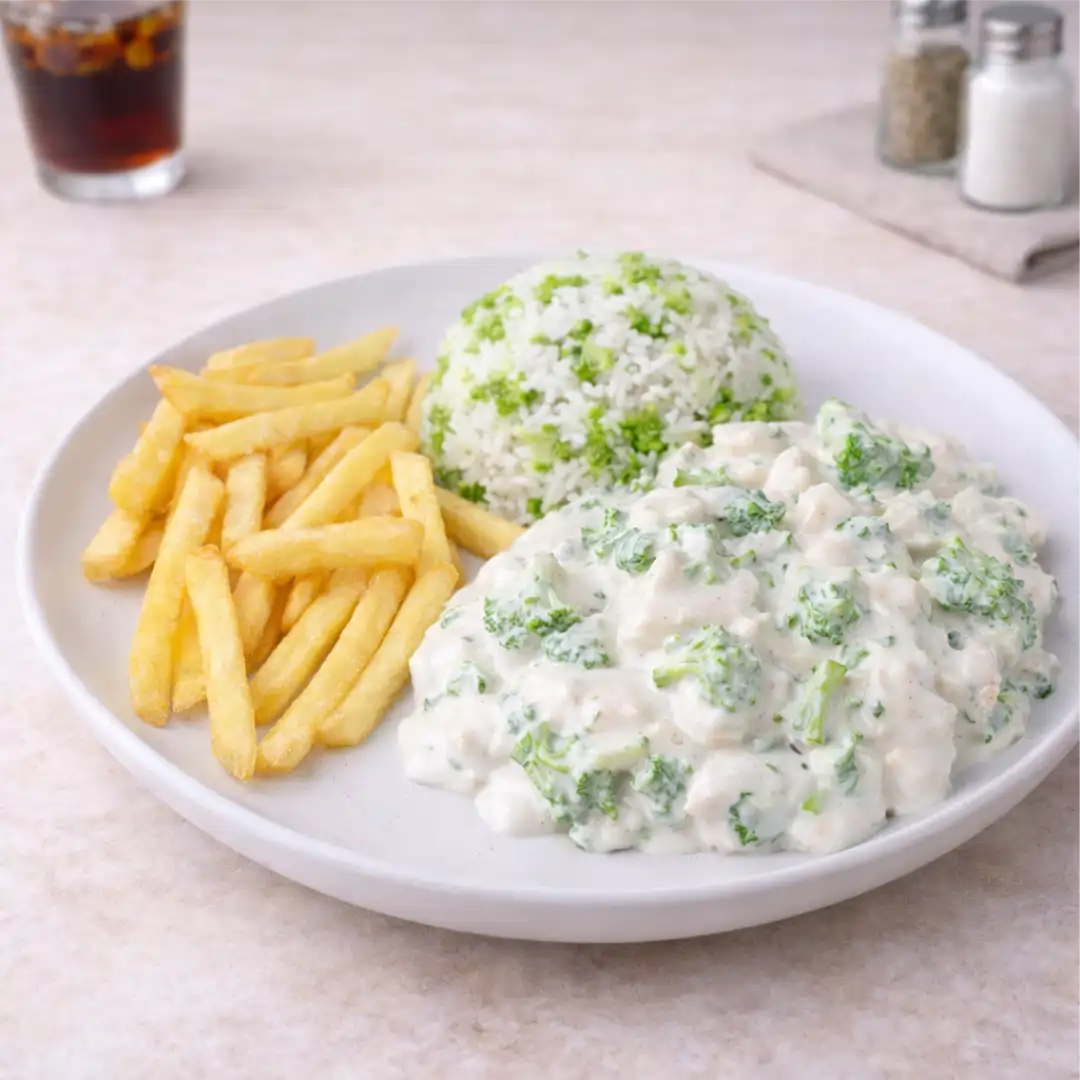 FILÉ, ARROZ C/ BRÓCOLIS, BATATA FRITA E MOLHO DE BRÓCOLIS.