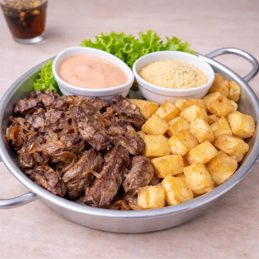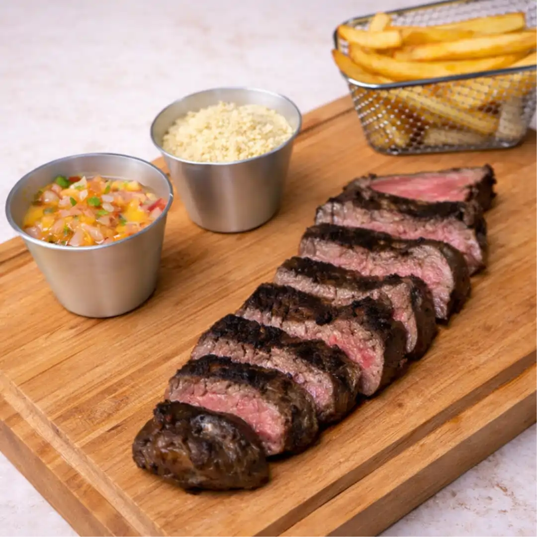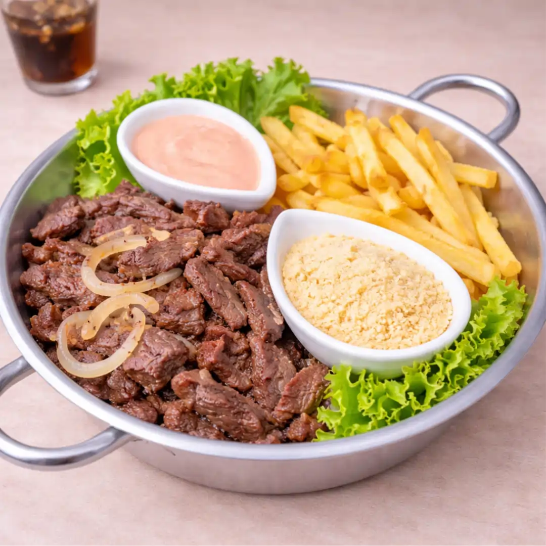 Aprox. 400g de filé mignon, batata frita, molho rosé e farofa.
