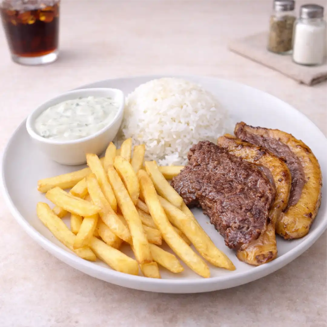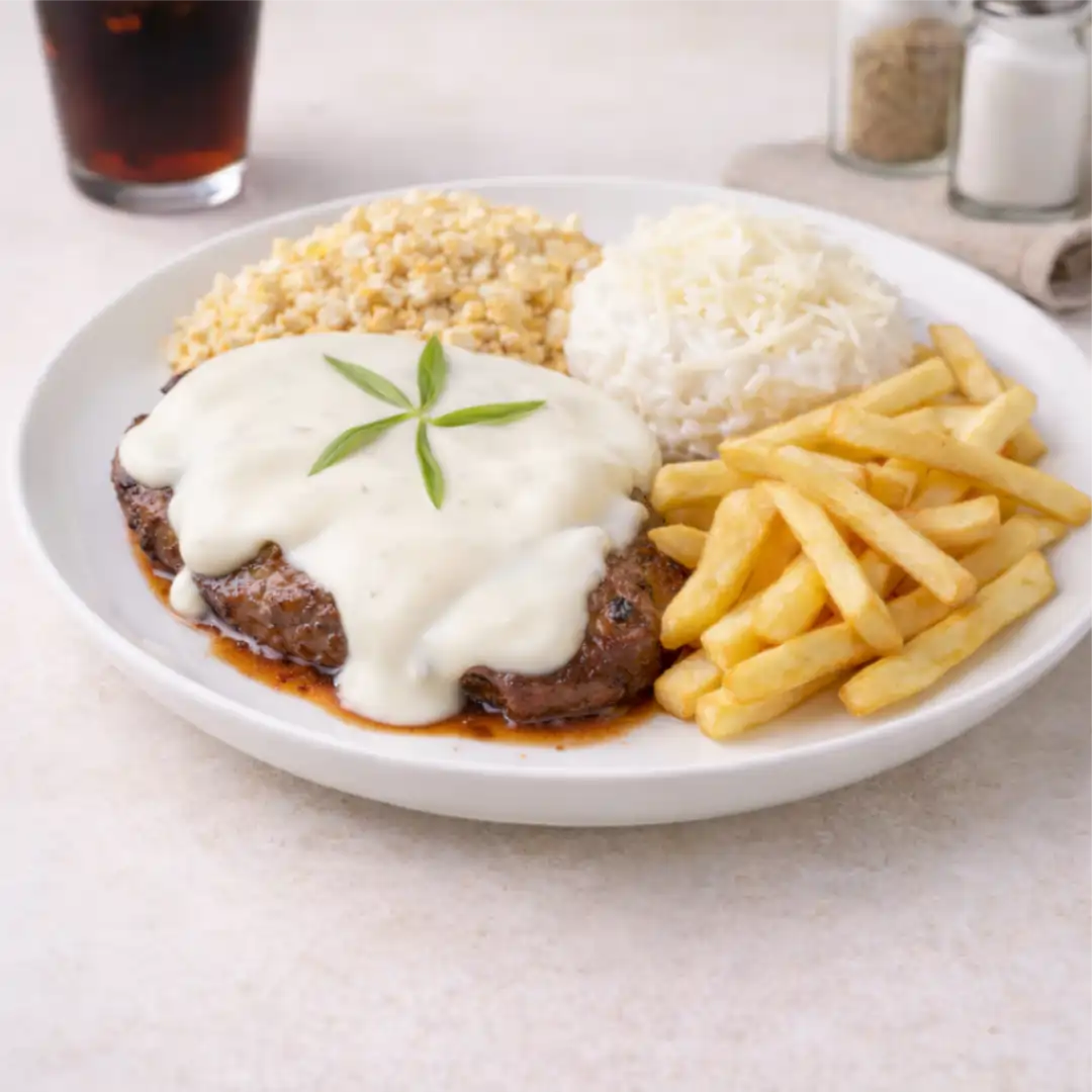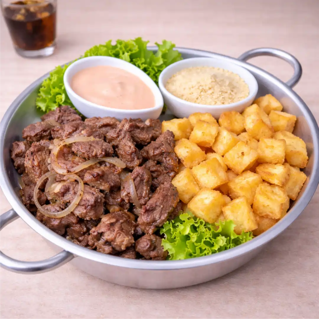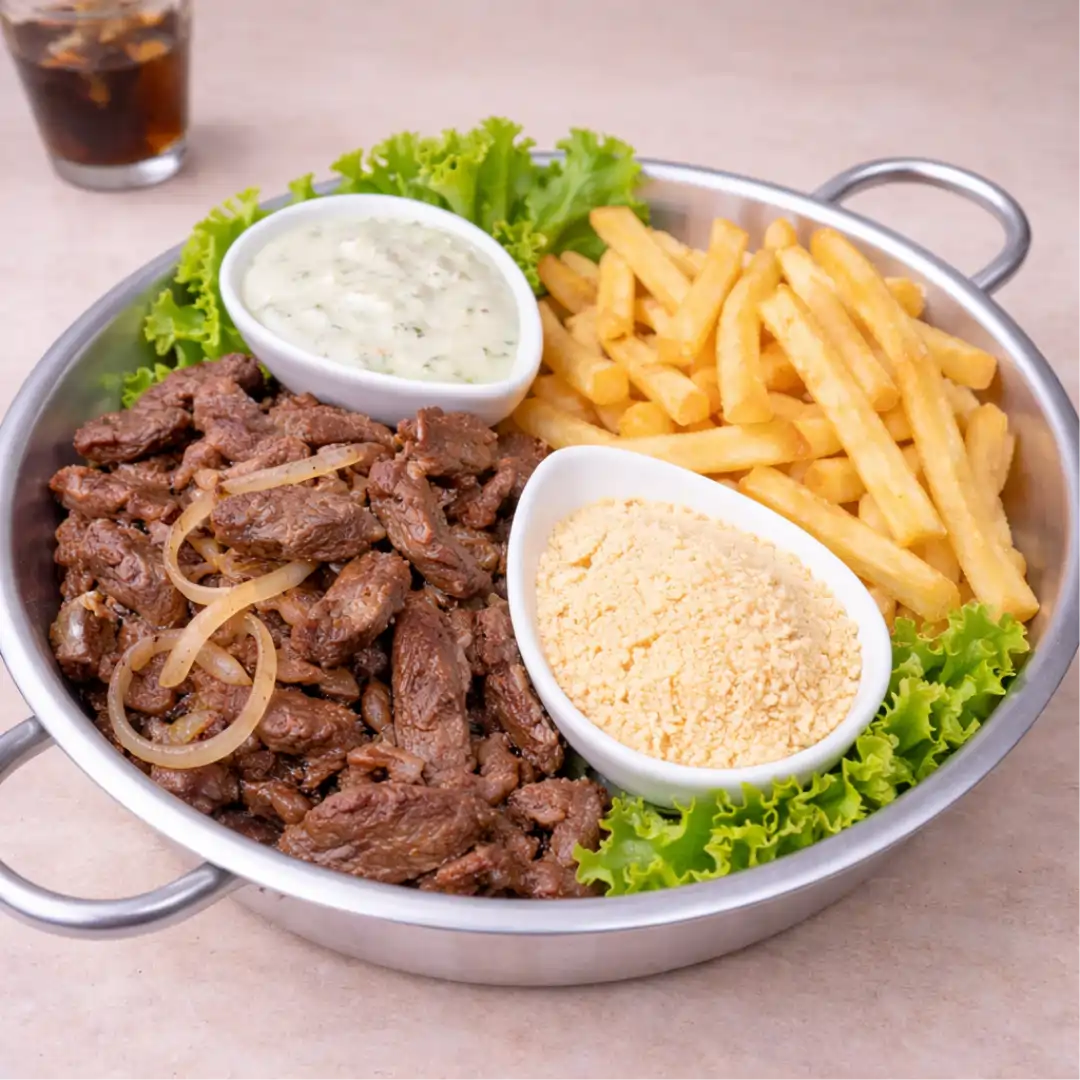 Aprox. 400g de filé mignon, batata frita, molho rosé e farofa.