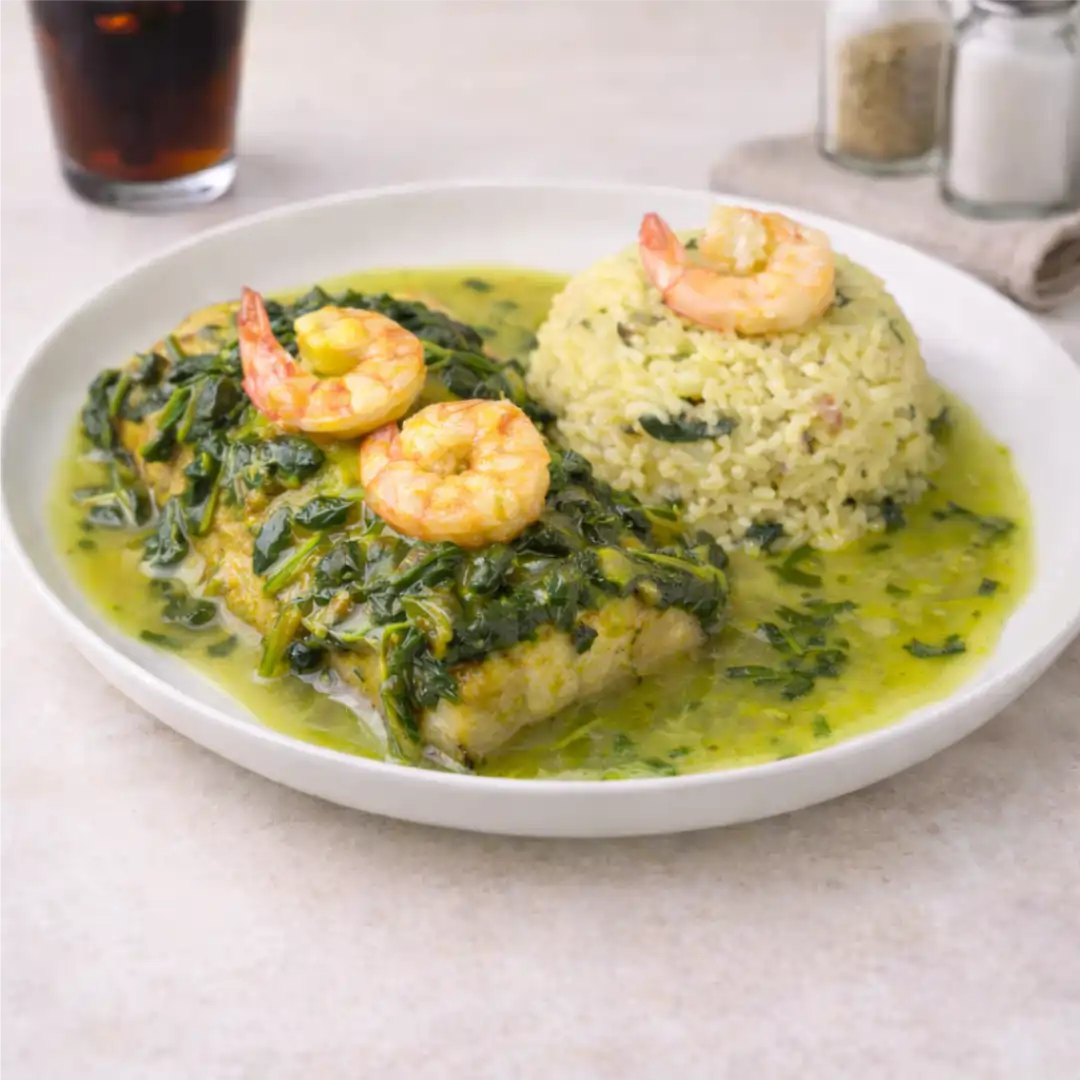 PESCADA AMARELA, CAMARÃO, ARROZ PARAENSE, JAMBÚ E TUCUPÍ.