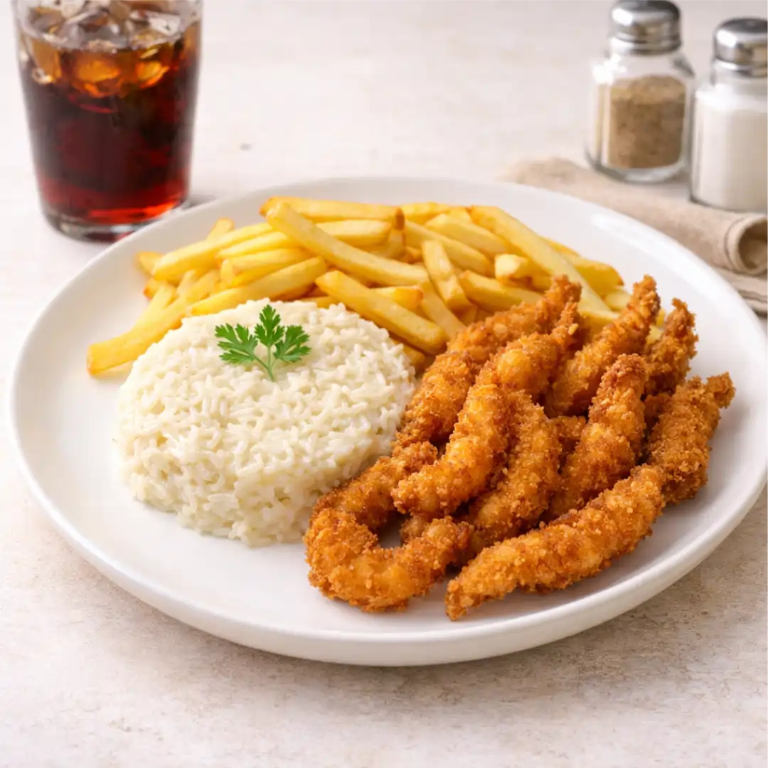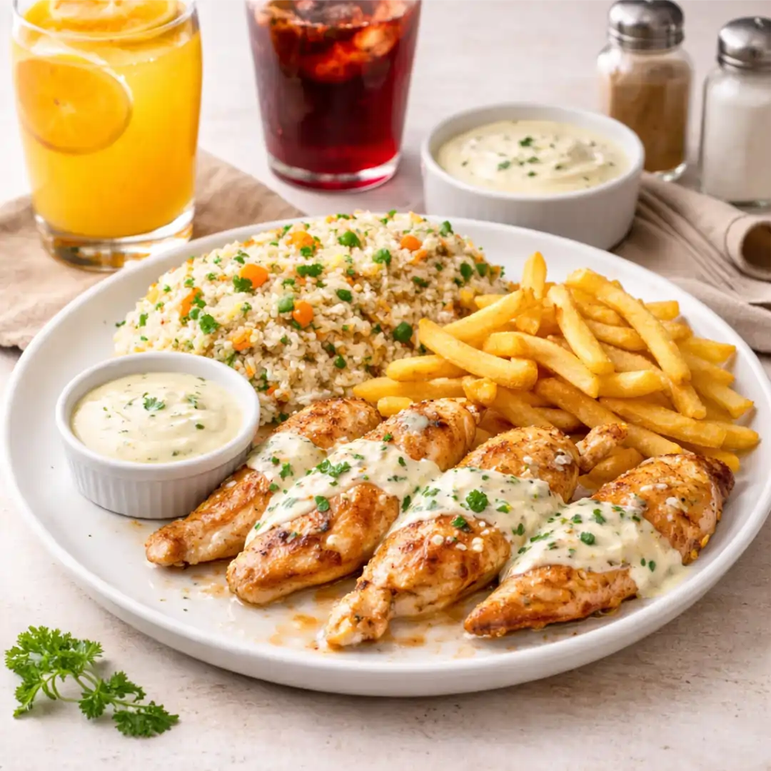 FILÉ DE FRANGO, ARROZ YAKIMESHI, MOLHO BRANCO E BATATA FRITA.