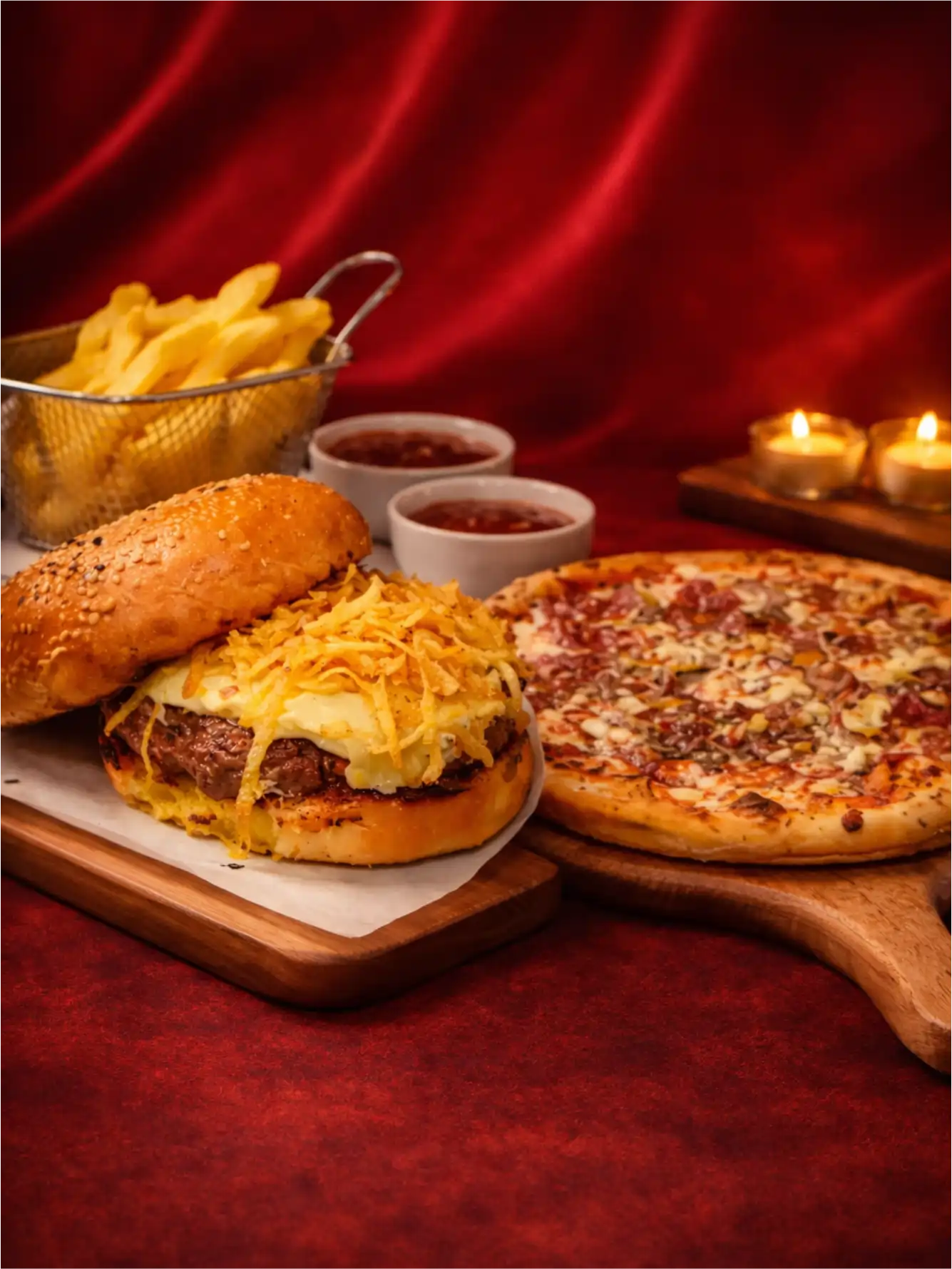ARROZ BRANCO ou MACARRAO, QUEIJO, BATATA FRITA E MOLHO VERMELHO.