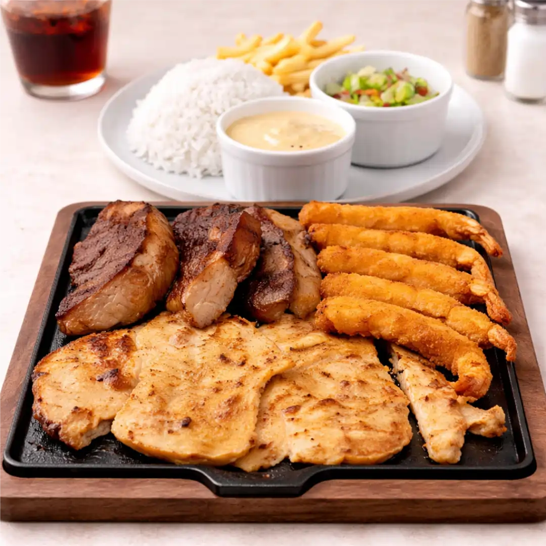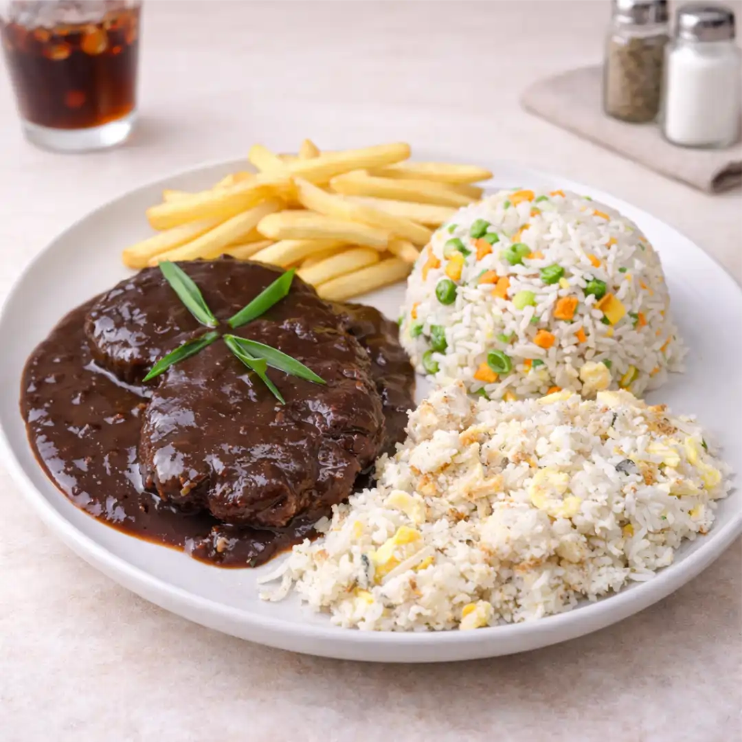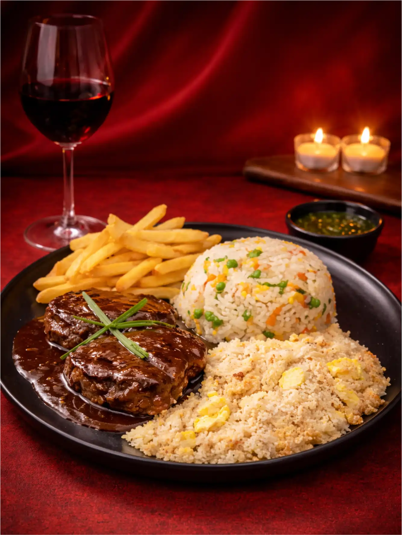 Filé, arroz yakimeshi, batata frita, farofa de ovo e molho de ervas.