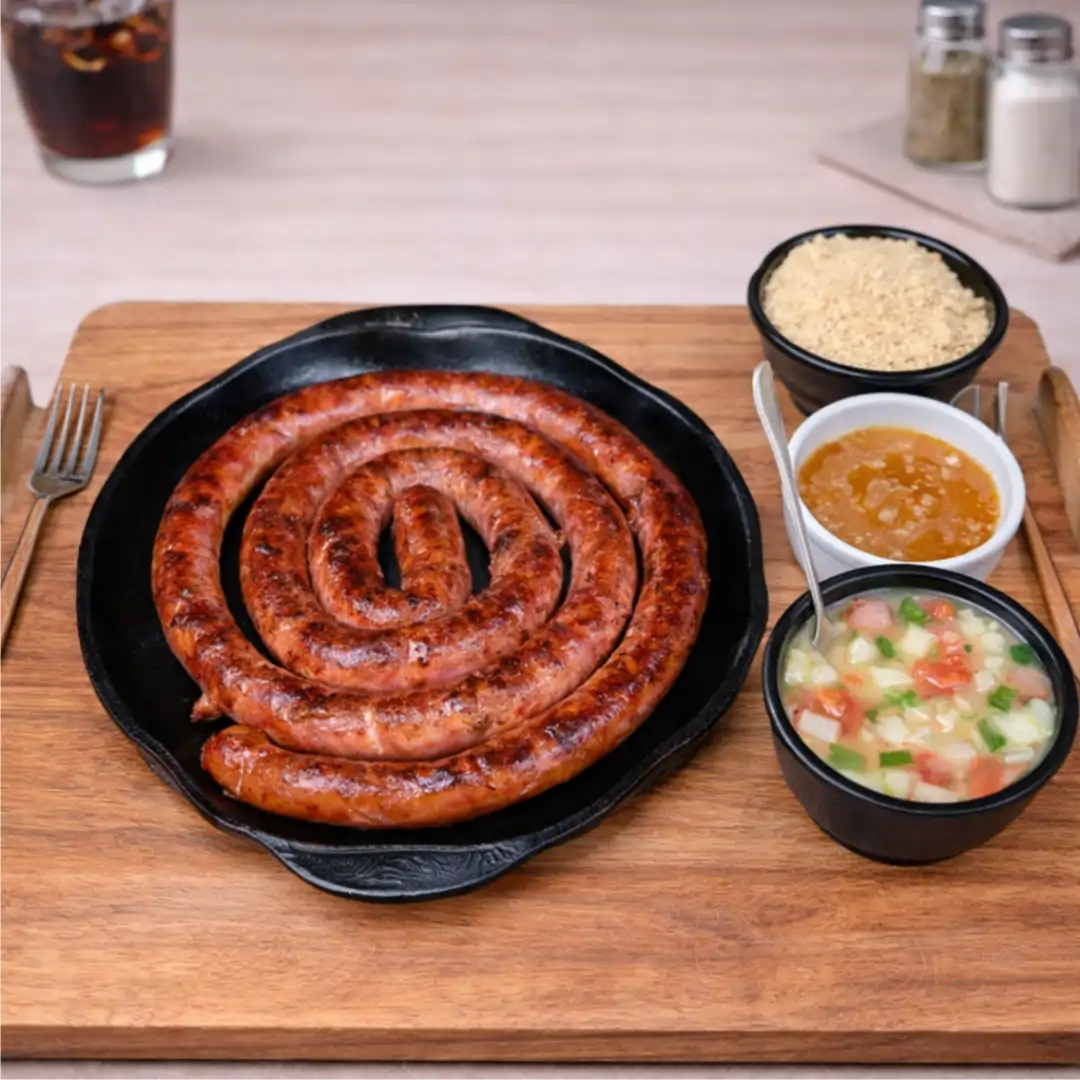 Aproximadamente 300g de linguiça apimentada, acompanhada de farofa, vinagrete, geléia de abacaxi e limão.