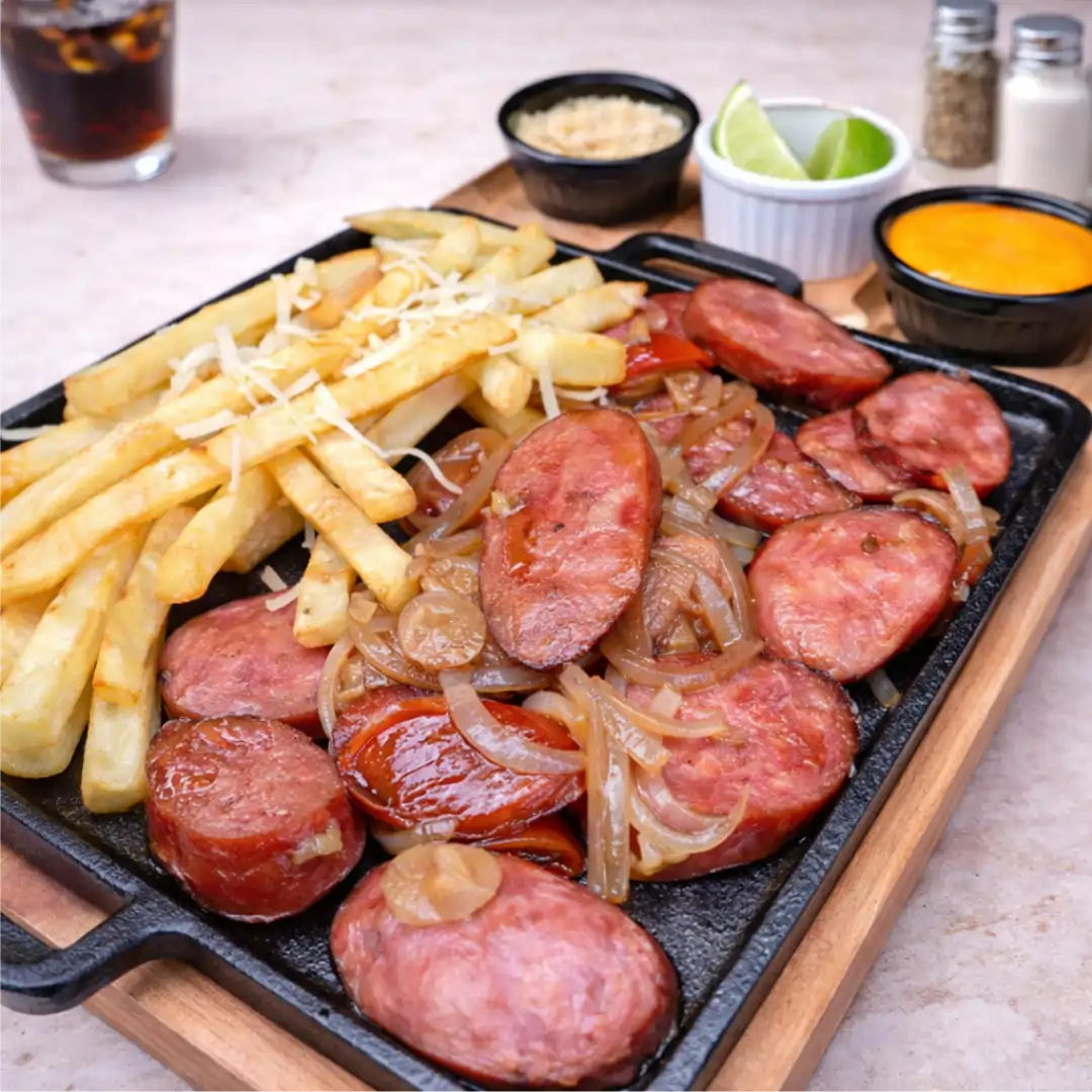 200g de calabresa, 200g de batata frita. Acompanha farofa, molho de cheddar e limão.