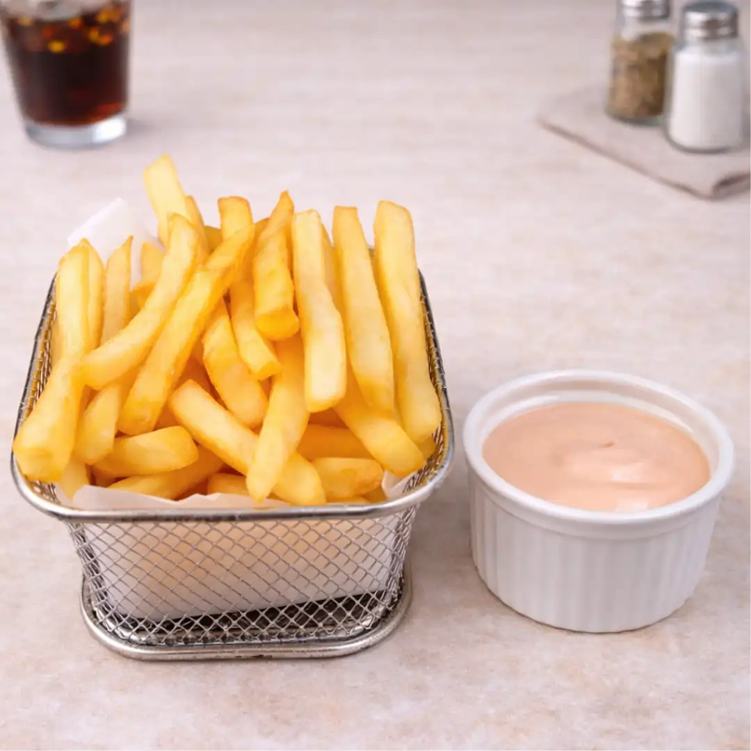 ARROZ BRANCO, BATATA FRITA E MOLHO DE MOSTARDA.