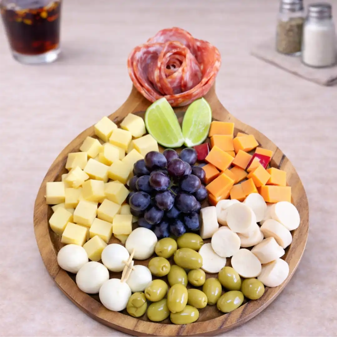 SALAME (10 FATIAS), MUSSARELA (100G), AZEITONA (60G), QUEIJO REINO (60G), PALMITO (60G) E 6 UNIDADES DE OVO DE CODORNA.