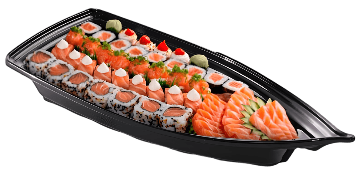 • Sashimi de salmão (5 un); • Niguiri Marajó Spice (5 un); • Casemirão Joy (5 un); • Uramaki Casemirão Premium (10 un); • Hot do Maçarico (10 un); • Mini temaki de salmão hot