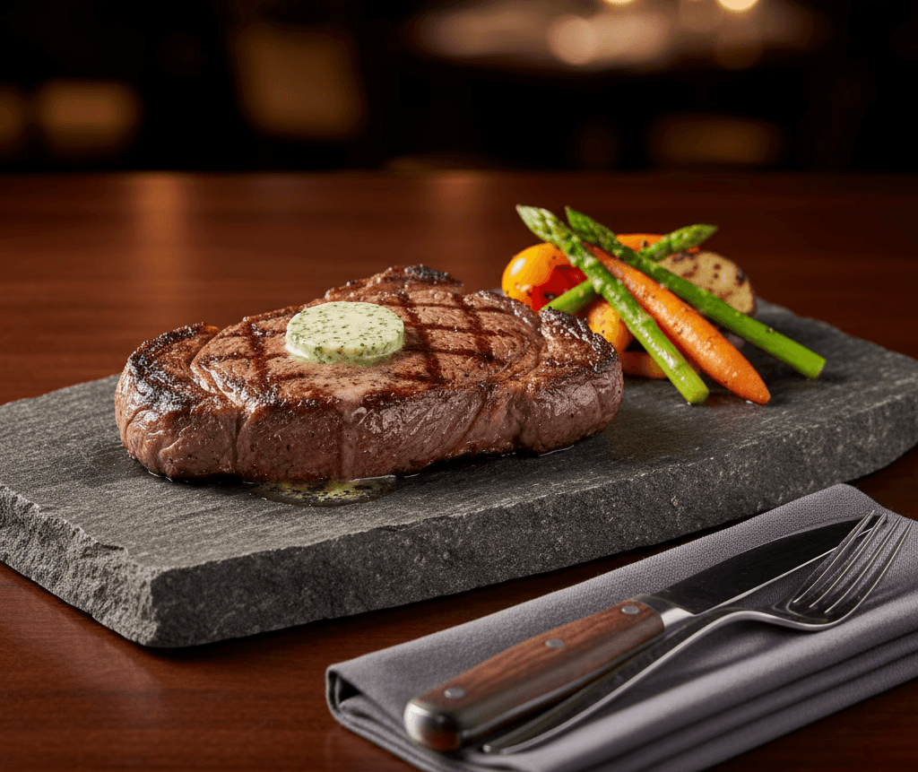 Corte Angus com manteiga de ervas e legumes assados