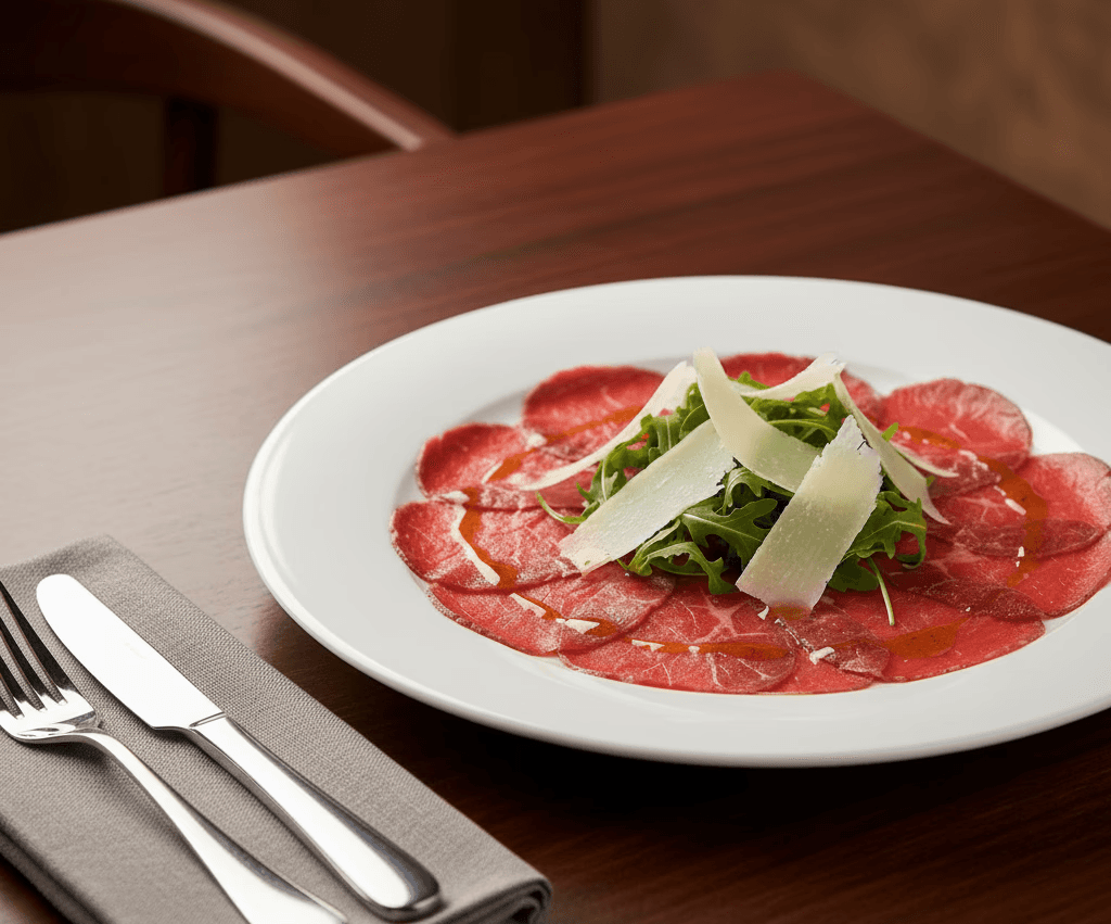 Lâminas finas de filé mignon, parmesão maturado e azeite trufado