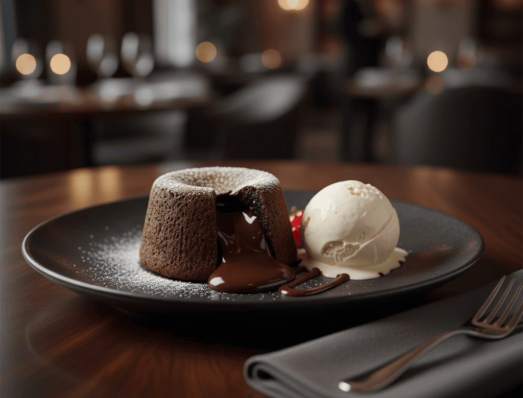Bolo quente com recheio cremoso e sorvete de baunilha