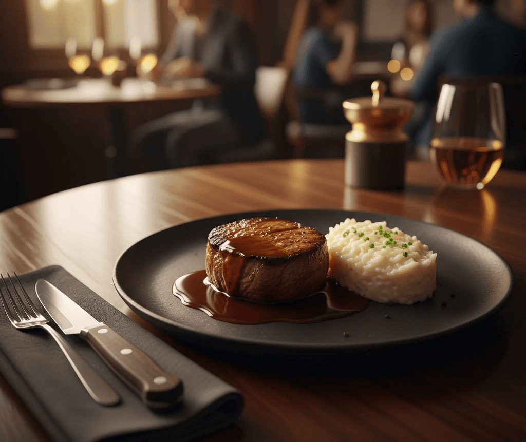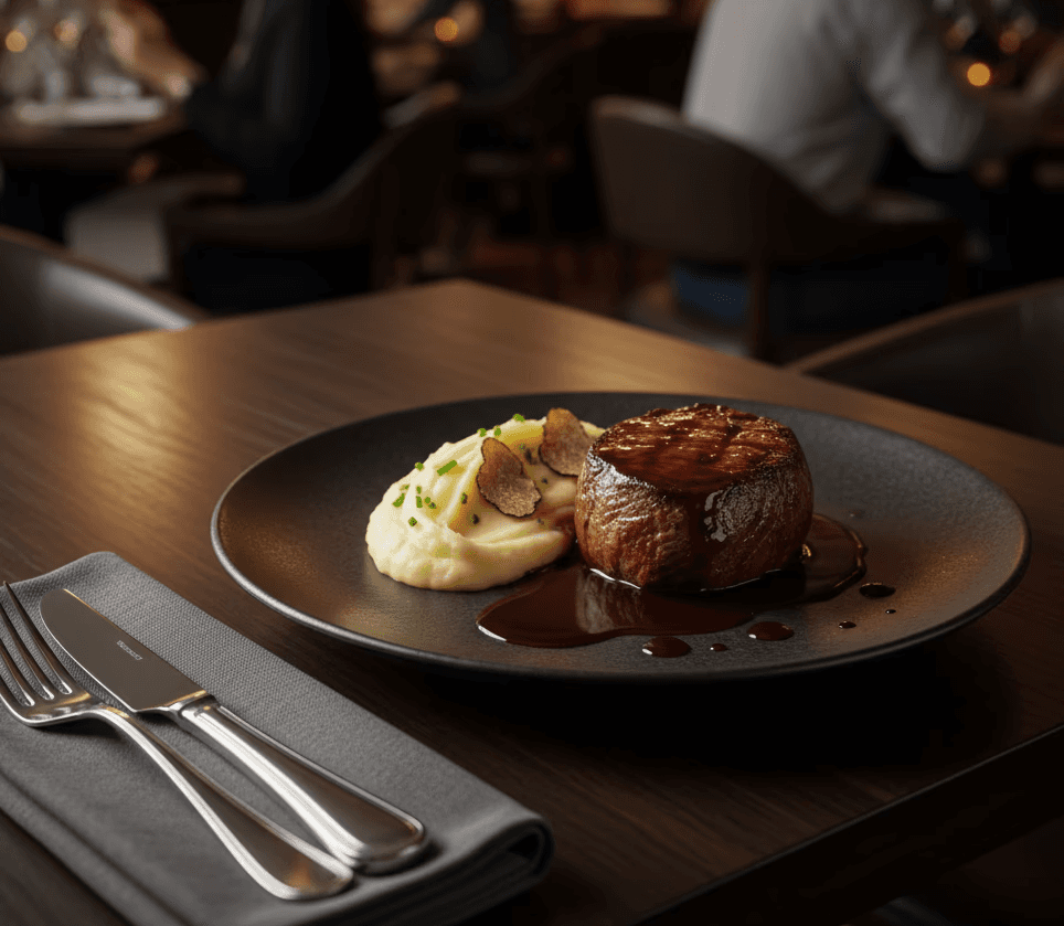 Filé alto com molho reduzido e purê trufado