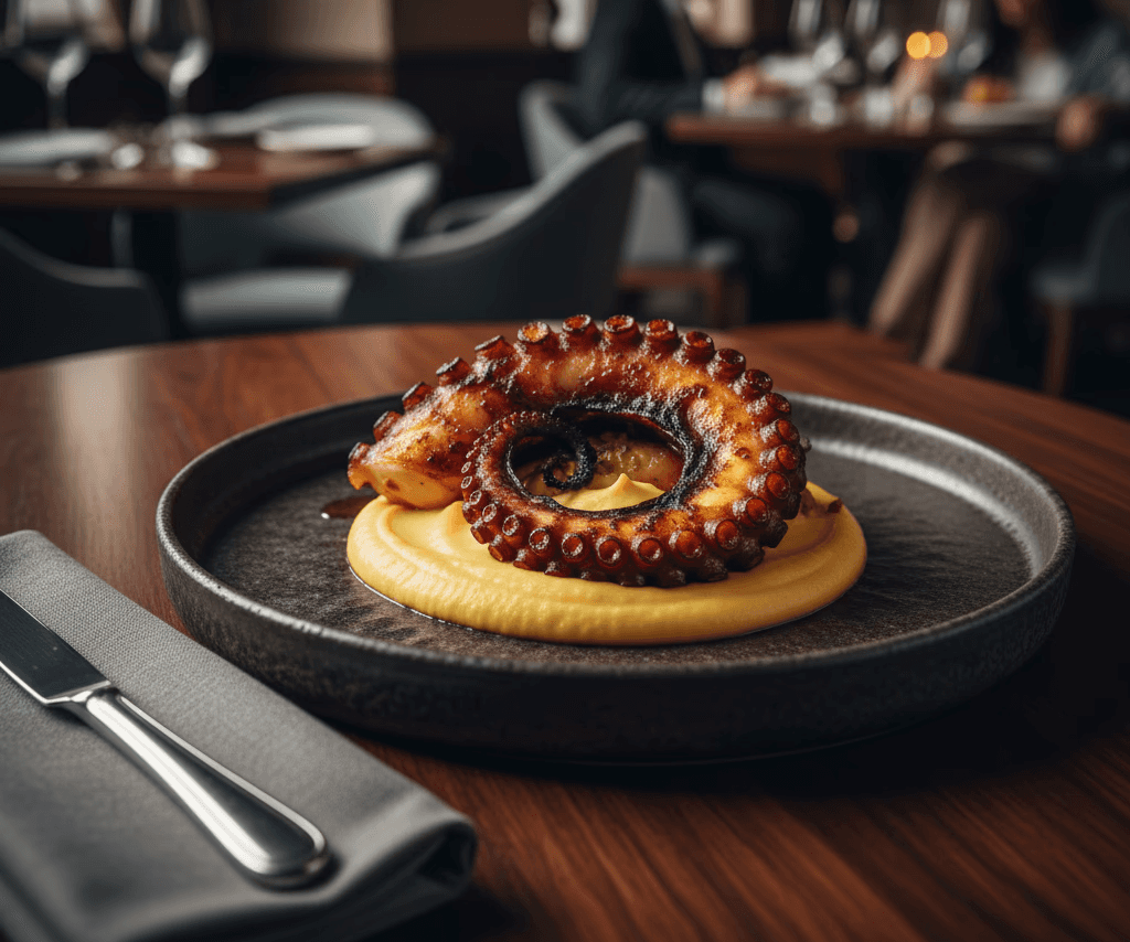 Polvo macio, purê de grão-de-bico e páprica defumada