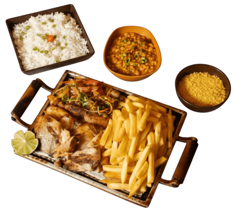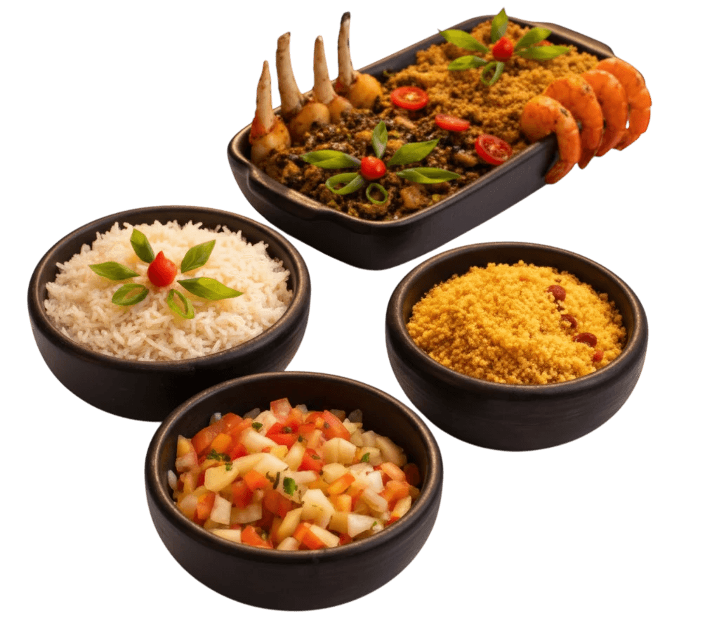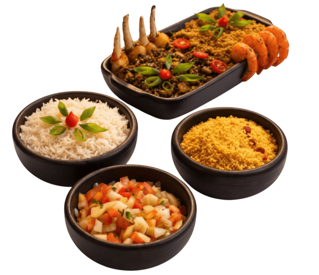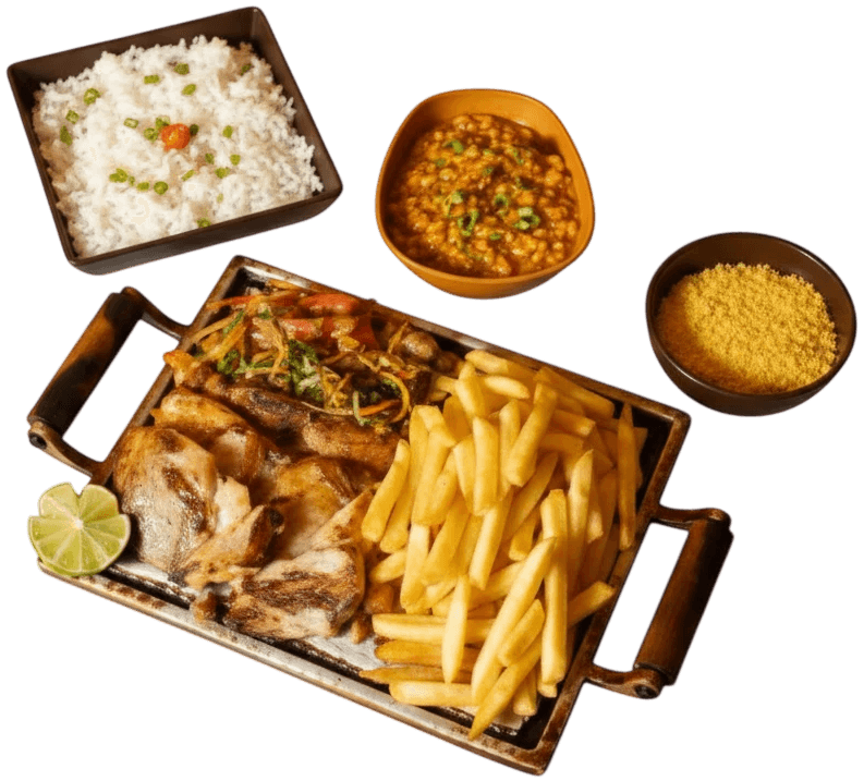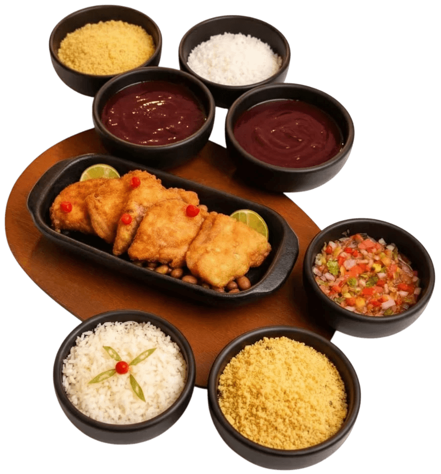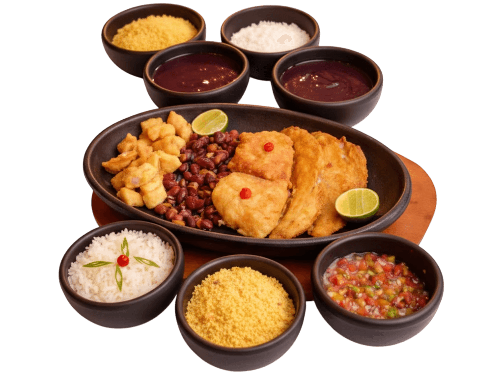 Filé mignon, frango, peixe e camarão, acompanhados de arroz, feijão, farofa, salada refogada e batata frita.