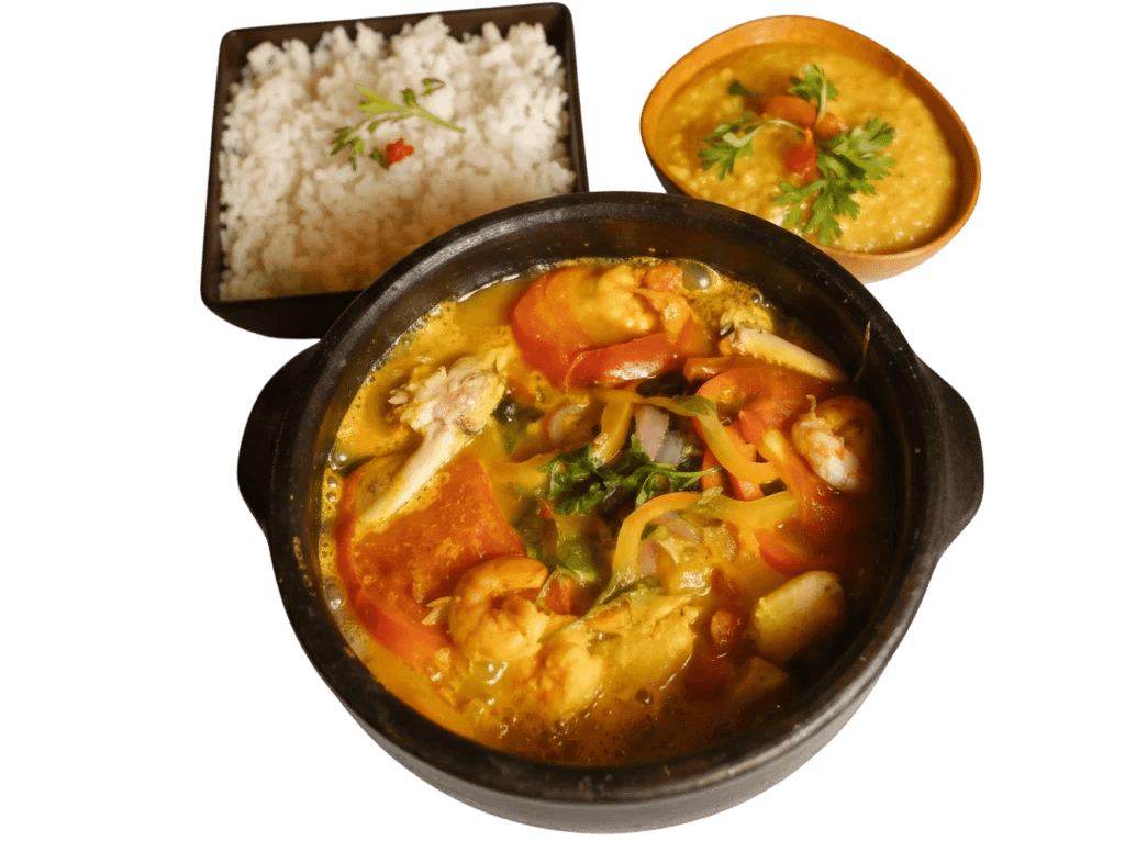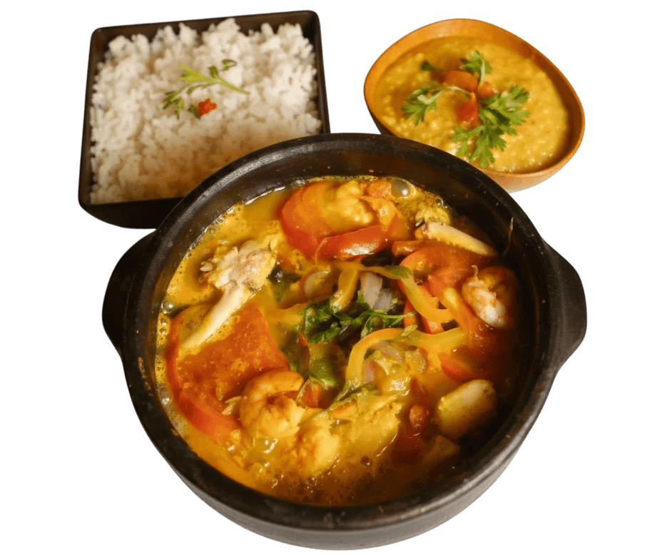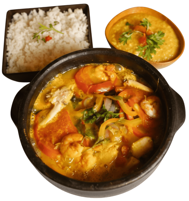 Arraia cozida no leite de coco com camarões, dendê, creme de leite, jambú e patas de caranguejo. Acompanha arroz branco e pirão