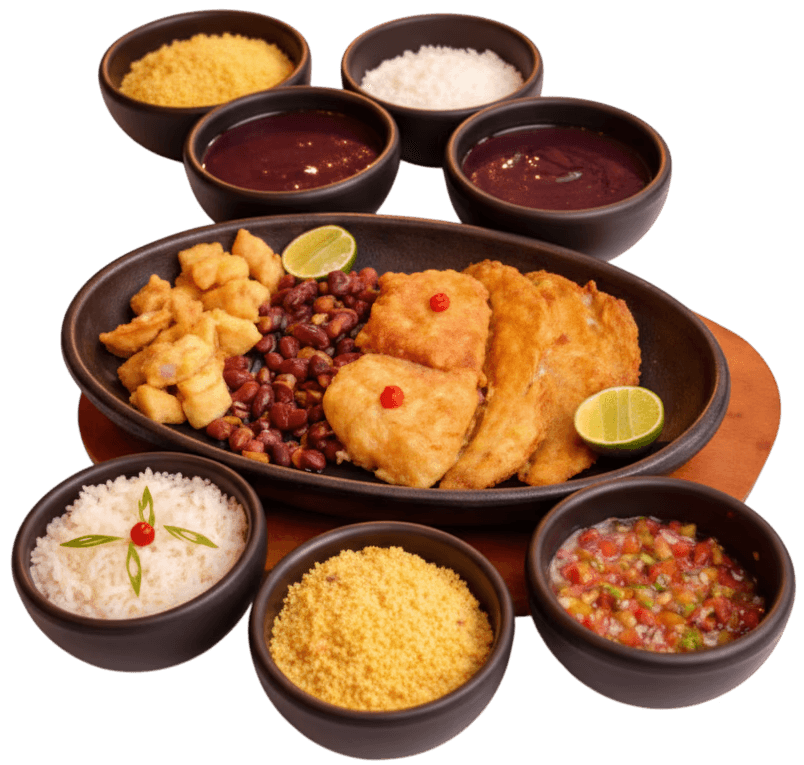 Iscas de filhote, pescada, gó e charque. Acompanha arroz, vinagrete, farofa e 2 porções de açaí fresco (com açúcar, farinha de tapioca e baguda).
