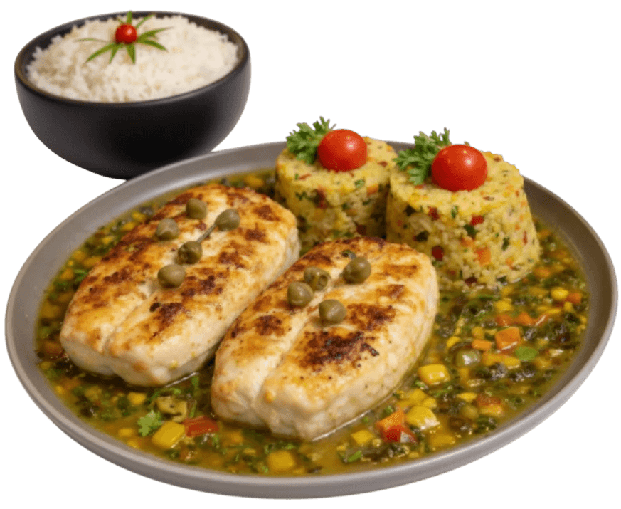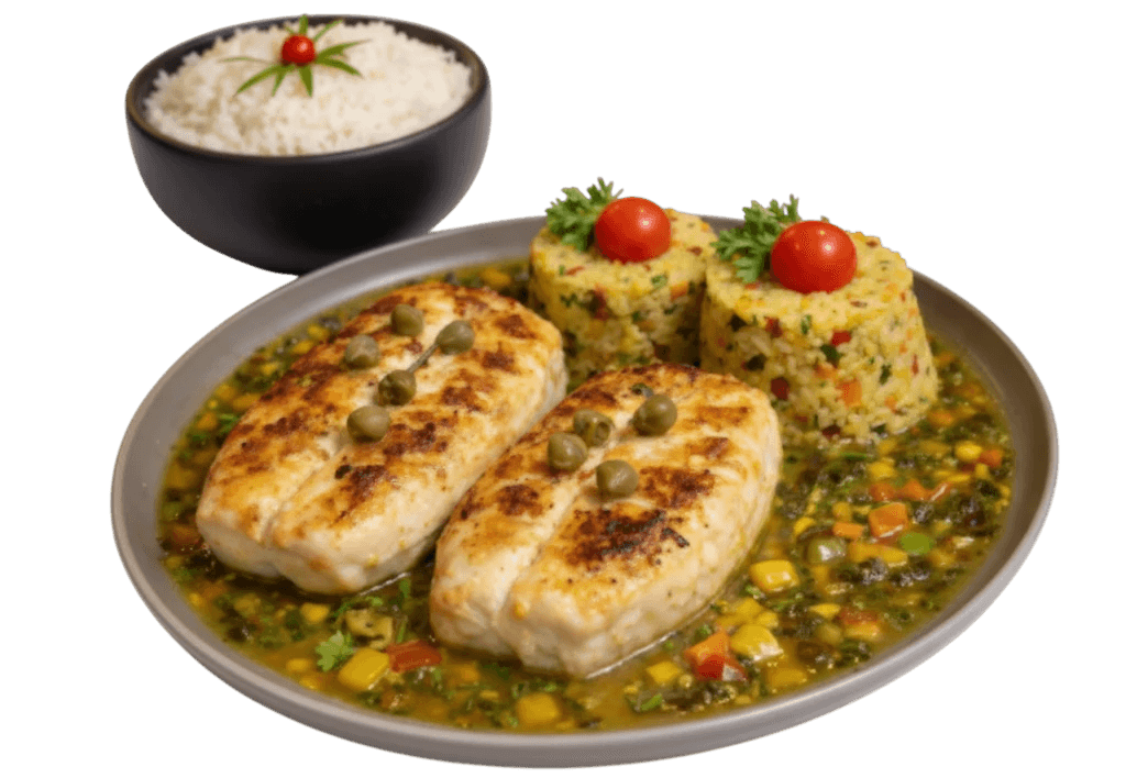 Peixe na chapa com velouté de tucupi, jambu e alcaparras. Acompanha pirão e arroz.