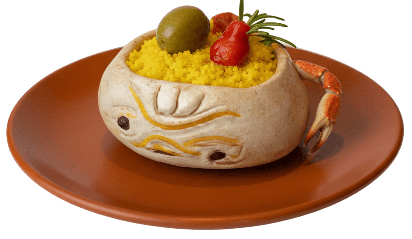 Arroz suculento com camarões ao leite de coco, massa de caranguejo, mexilhão e patas de caranguejo. Finalizado com parmesão e batata palha.