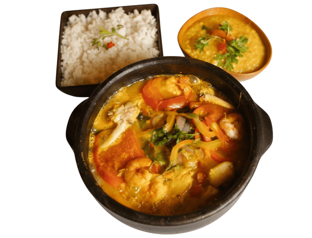Filé de Peixe, camarões, patas de caranguejo, ovos cozidos, batata, jambu e pirão. Acompanha arroz branco.