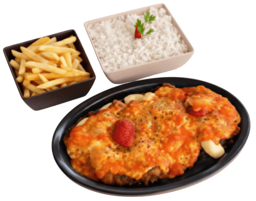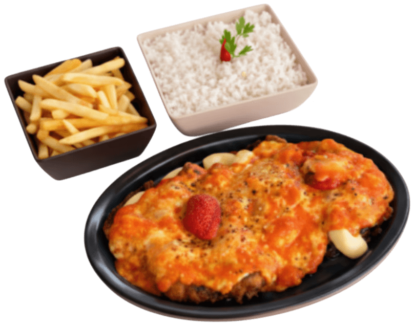 Filé mignon empanado, molho artesanal de tomate e a legítima cremosidade do Catupiry. Acompanha arroz e fritas.