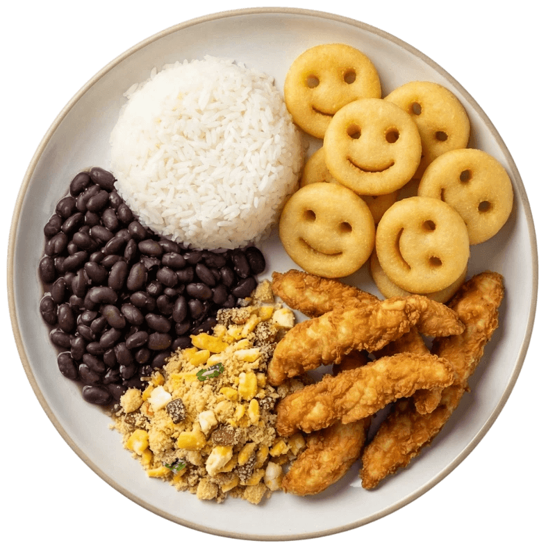 Arroz branco, feijão, batata smiles e farofa de ovo.( Escolha entre isca de filé bovino, frango ou peixe fresco.)