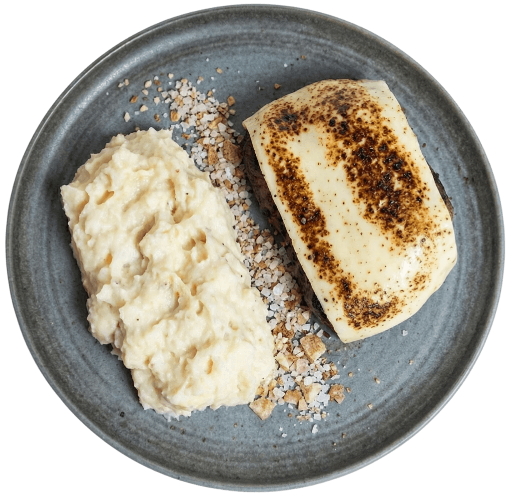 Peixe com creme de queijo e banana-da-terra maçaricado. Com arroz e farofa.