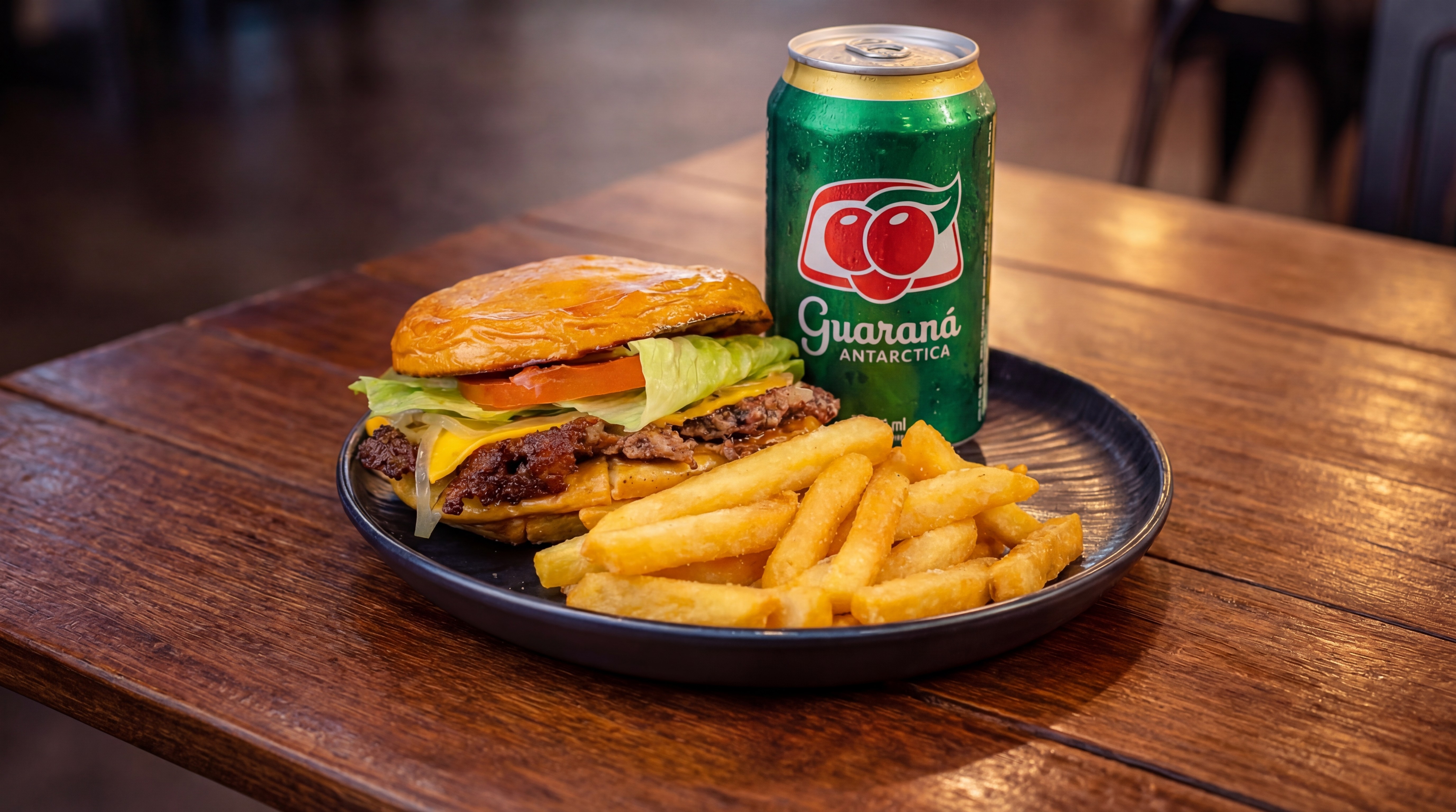 Pão brioche, smash de 80 gramas, queijo cheddar, alface, tomate e cebola, 100 gramas de batata frita + um guaraná em lata.