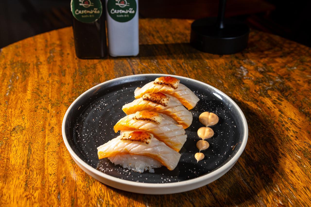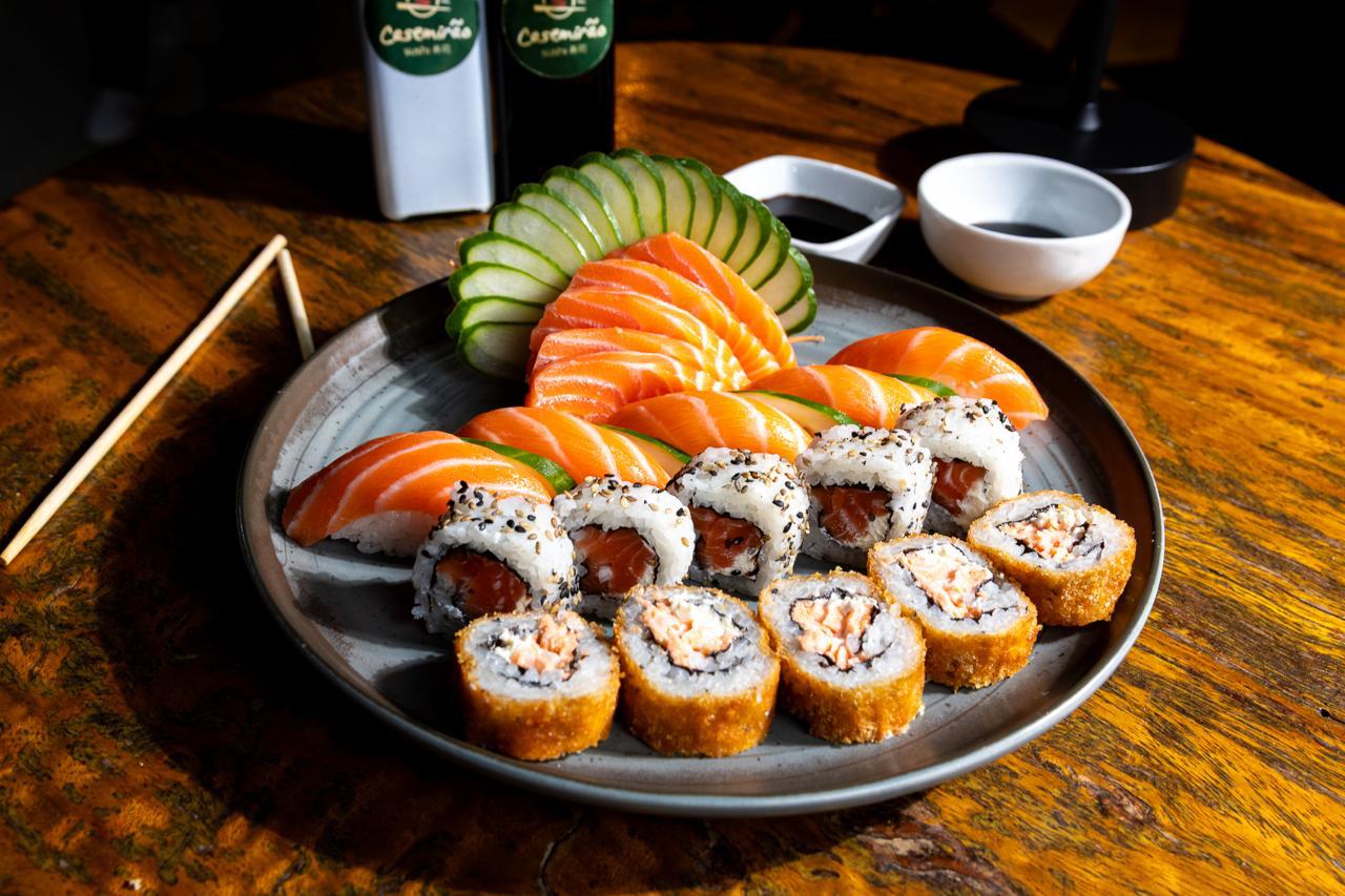 • Sashimi de salmão (5 un); • Niguiri Marajó Spice (5 un); • Casemirão Joy (5 un); • Uramaki Casemirão Premium (10 un); • Hot do Maçarico (10 un); • Mini temaki de salmão hot