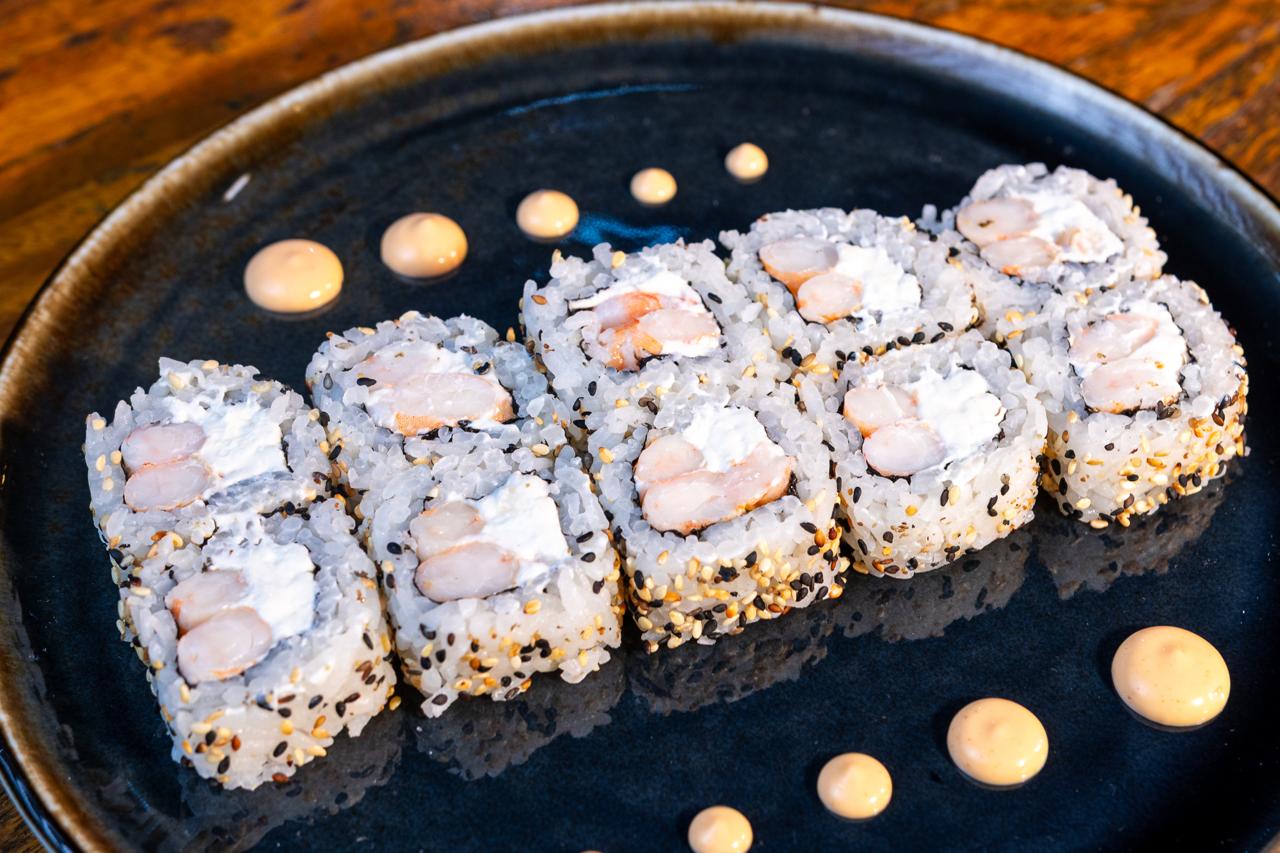 Camarão grelhado com pesto, camarão furai, molho tare, cream cheese, sonomono, geleia de pimenta e batata chips.