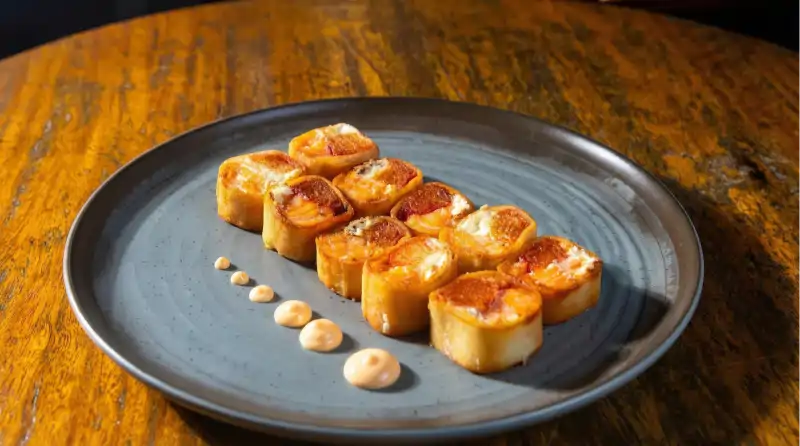 Salmão, camarão, queijo do Marajó, ova de masago, molho spice e massa harumaki.
