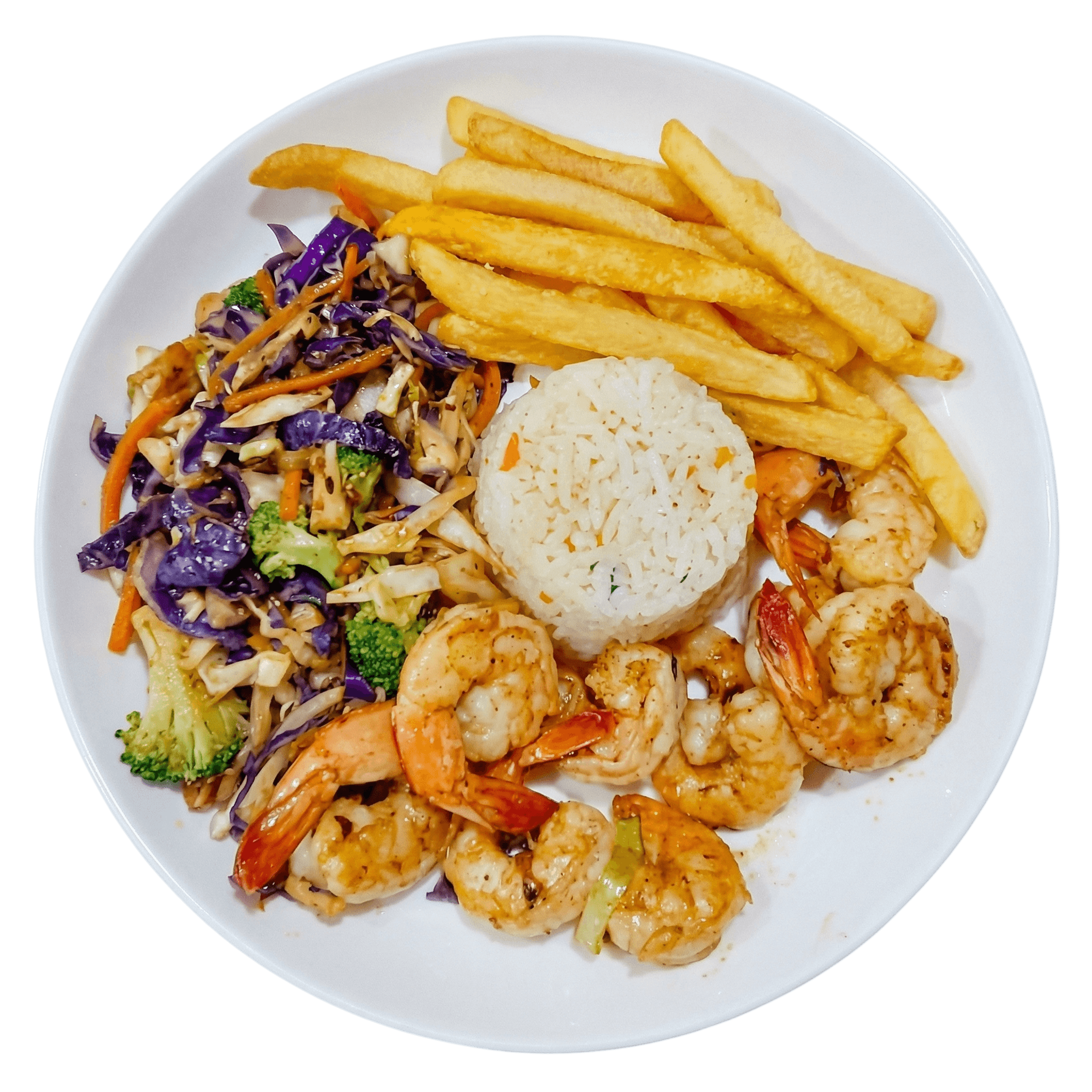 Camarões na chapa, arroz yakimeshi (ou arroz branco), legumes, batata frita e farofa. (Serve até 1 pessoa.)