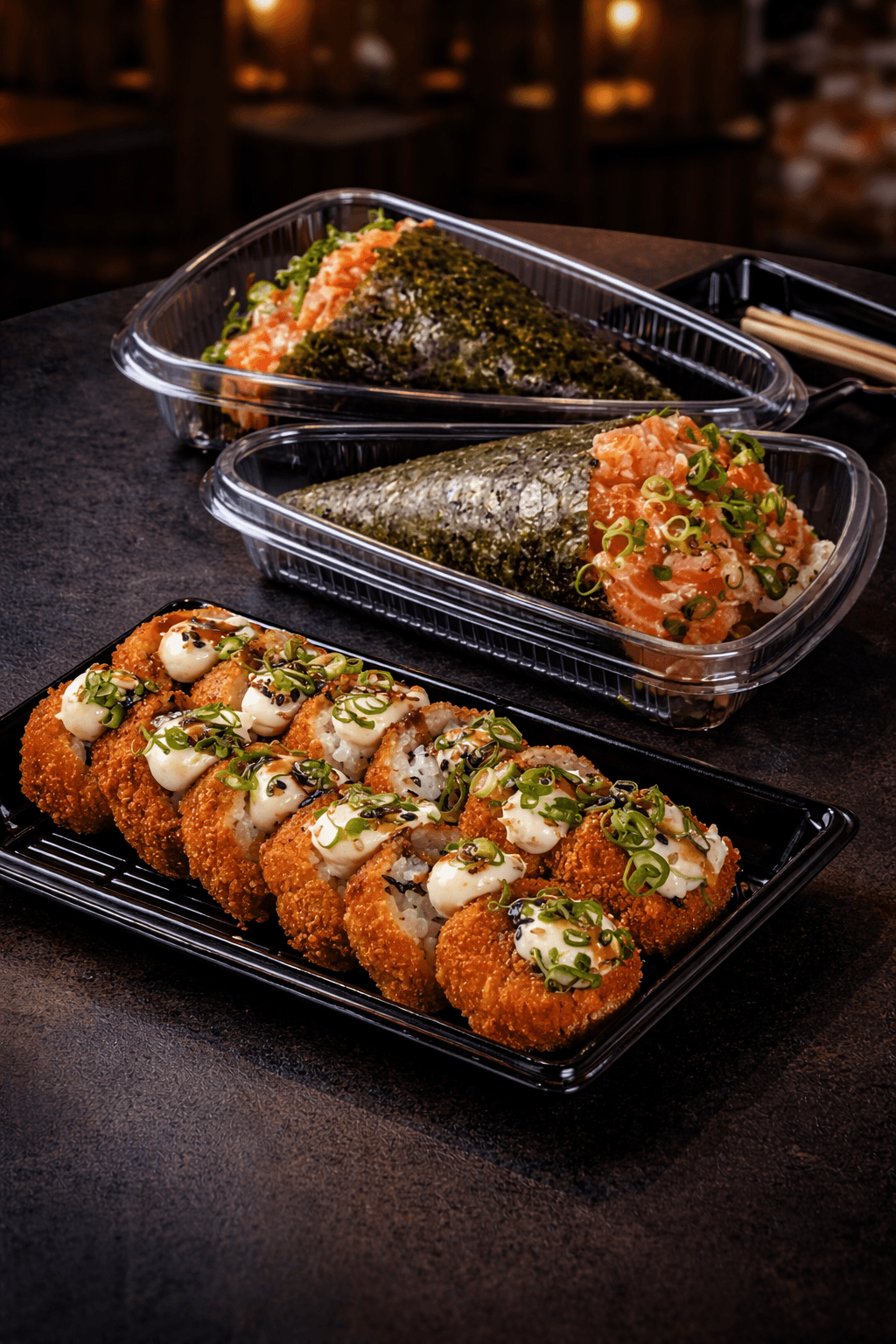 Combinações completas com arroz yakimeshi, molhos especiais e ingredientes selecionados.