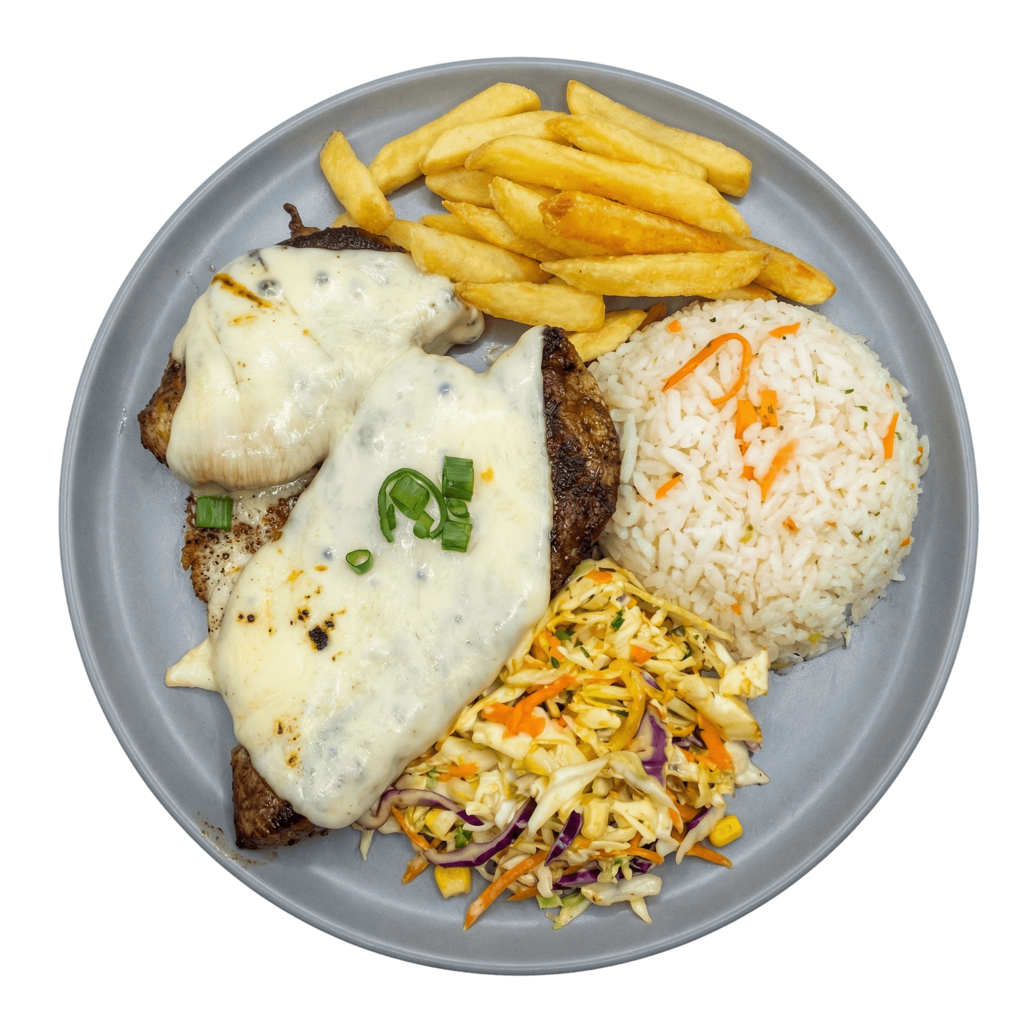 Filé na chapa com queijo, arroz, legumes, batata frita e farofa. (Serve até 1 pessoa.)